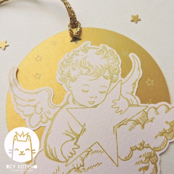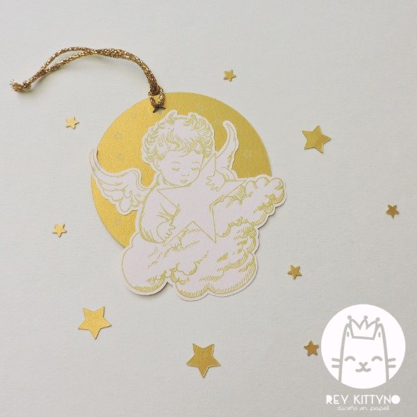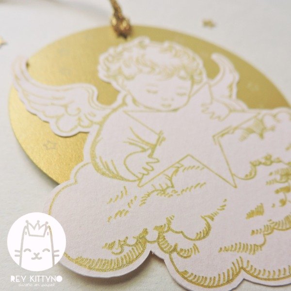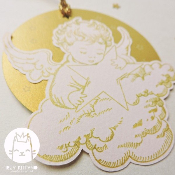 Tarjetas navideñas realizadas en papel texturado con fondo color oro, dibujadas en dorado.Vienen 5 tarjetas x pack con cordón dorado.